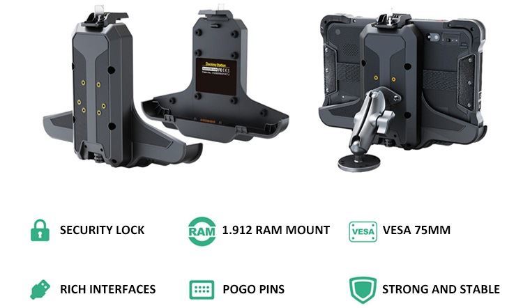 a vše v jednokabelovém řešení - protivibrační a nárazový standard US MIL-STD-810G - ruční popruh pro manipulaci - zabudovaná Wifi, Bluetooth, GPS, 4G, baterie, volitelné NFC, fotoaparát, otisk prstu, 1D/2D skener.