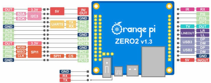 - 13-pin header with 2x USB, analog stereo audio output, CVBS video output, IR input, 3x GPIOs