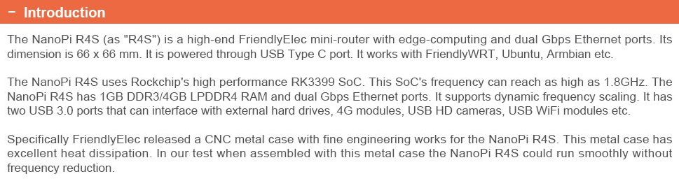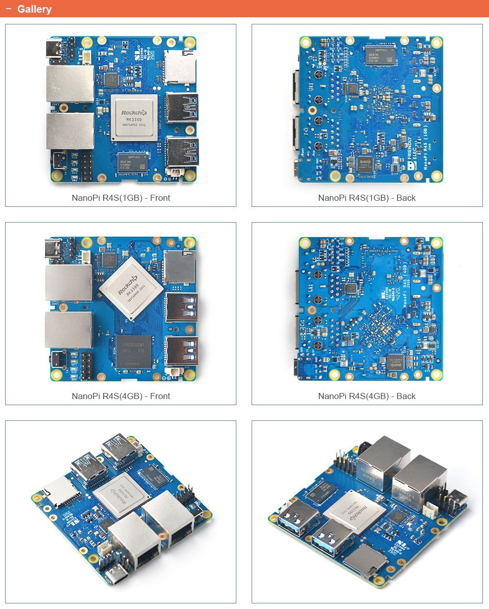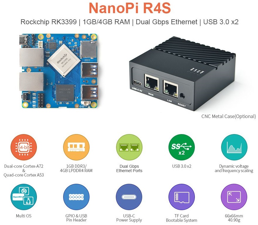 NanoPi R4S je na RK3399 SoC založená ARM deska. Má stejnou formu faktoru jako RPi B3+ a má také porty a rozhraní kompatibilní s RPi B3+.
