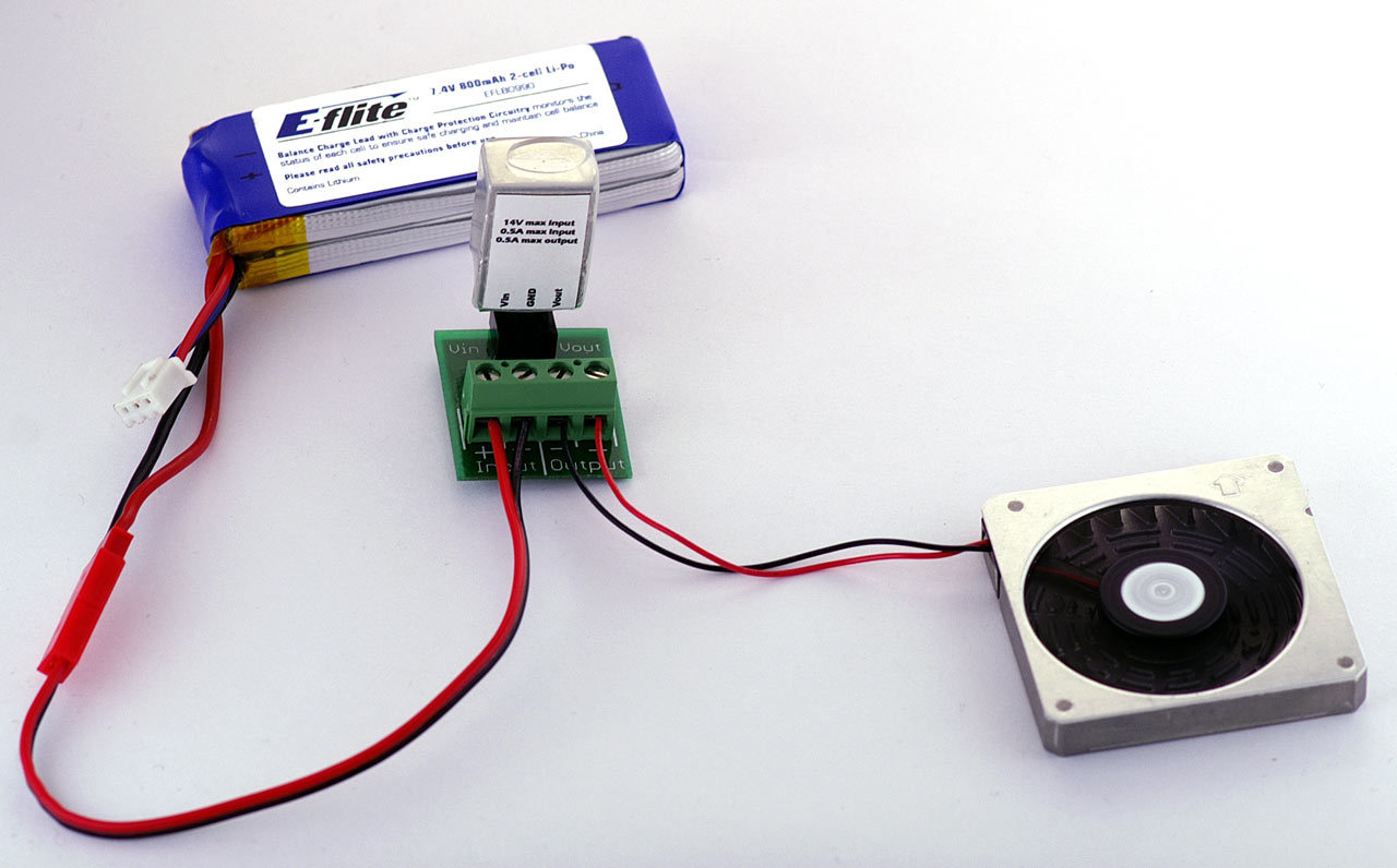 Pokud vám nevyhovuje pájení, může vám pomoci naše deska plošných spojů s regulátorem napětí. Rozšiřuje připojovací kolíky regulátoru na sadu svorkovnic, se kterými se snadněji manipuluje.