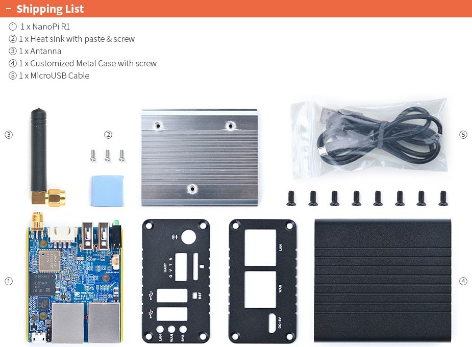 The NanoPi R1("R1") is a complete open source board developed by FriendlyElec for makers, hobbyists, fans and etc. The NanoPi R1 has one Gbps Ethernet port and one Fast Ethernet port.
