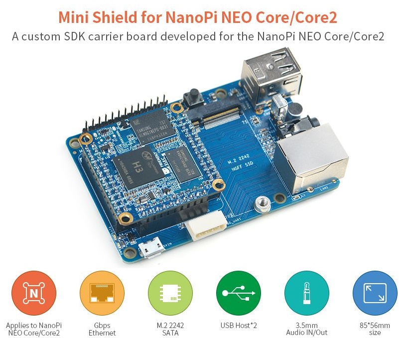 The Mini Shield for NanoPi NEO Core/Core2 is a custom SDK carrier board developed for