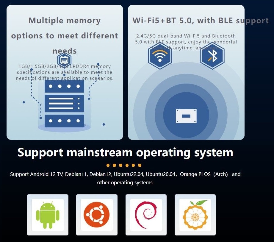 | Supported OS | Android 12 TV,Debian11,Debian12,Ubuntu22.04,Ubuntu20.04,Orange Pi OS(Arch) |