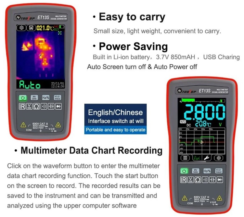 TOOLTOP ET13S je inovativní termokamera s 192*192 IR pixely a multimetr s 2,8palcovou dotykovou obrazovkou.